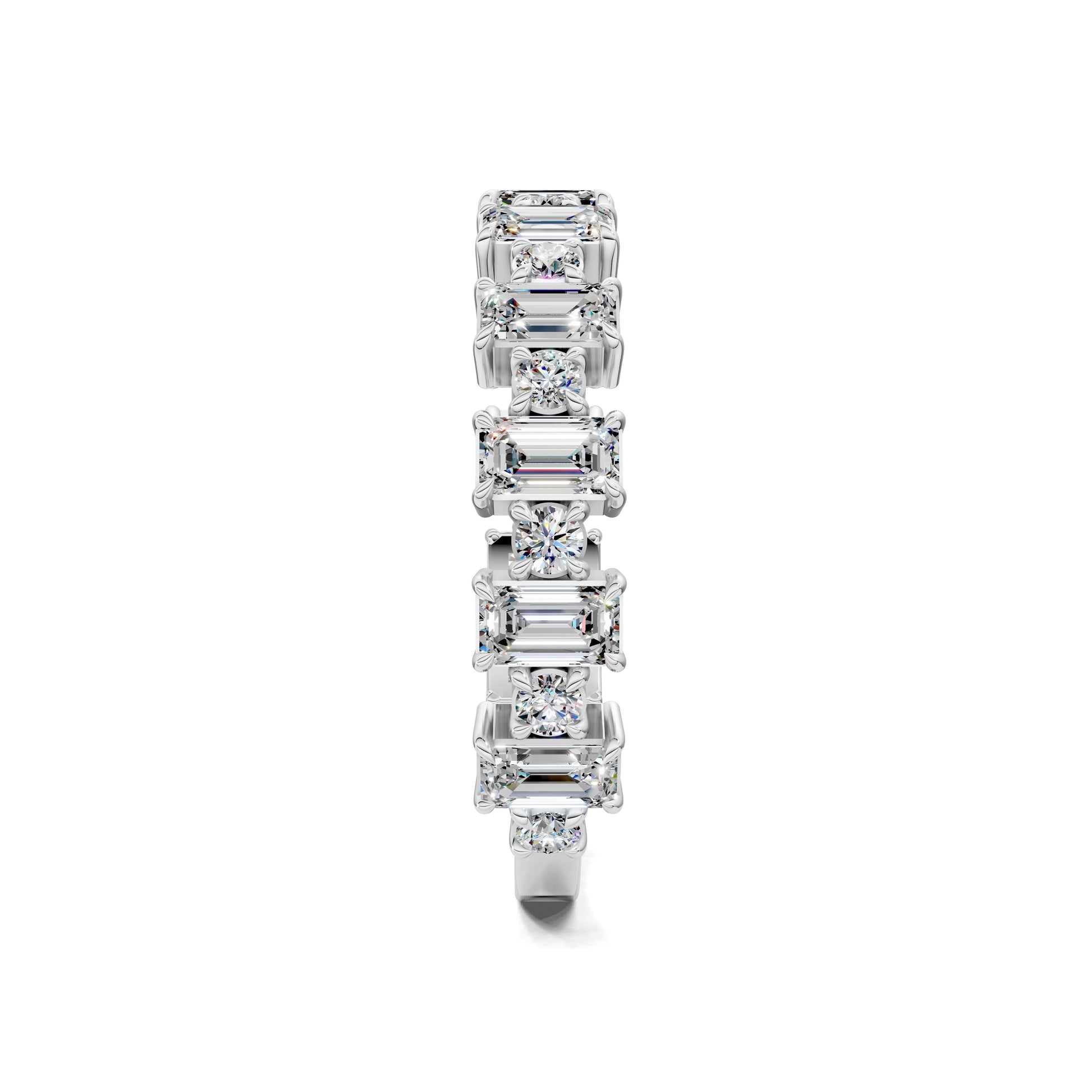 The Maria Wedding Band features a distinctive, modern design crafted in gold. Emerald-cut and round diamonds alternate horizontally, creating a luxurious blend of sharp lines and elongated facets. Ideal as a wedding band or a statement piece, this ring effortlessly merges classic beauty with contemporary elegance.